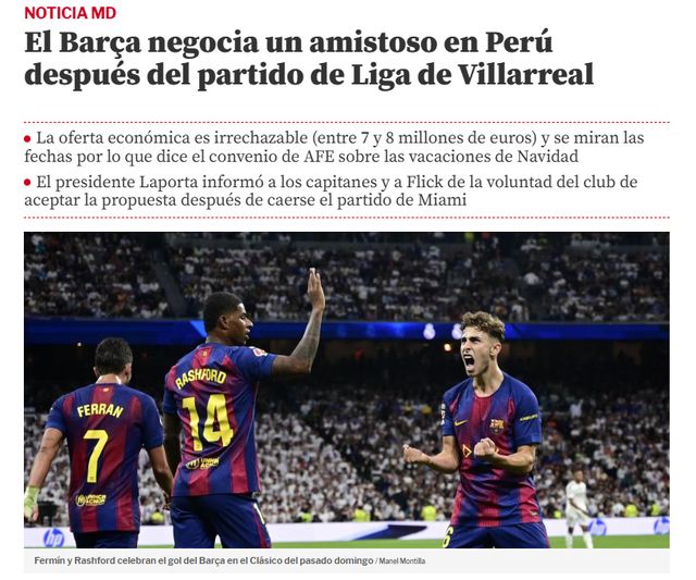 这是来自秘鲁的邀约,组织者希望巴萨能在12月份来秘鲁踢商业赛,开价700万-800万欧元。巴萨收到邀请,非常愿意前往秘鲁。用该报的话来说,这是“无法拒绝的丰厚收入”。